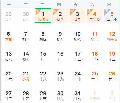 2019年勞動節放假通知安排如下:2019年5月1日至4日放假調休,共4天。4月28日(星期日)、5月5日(星期日)上班。