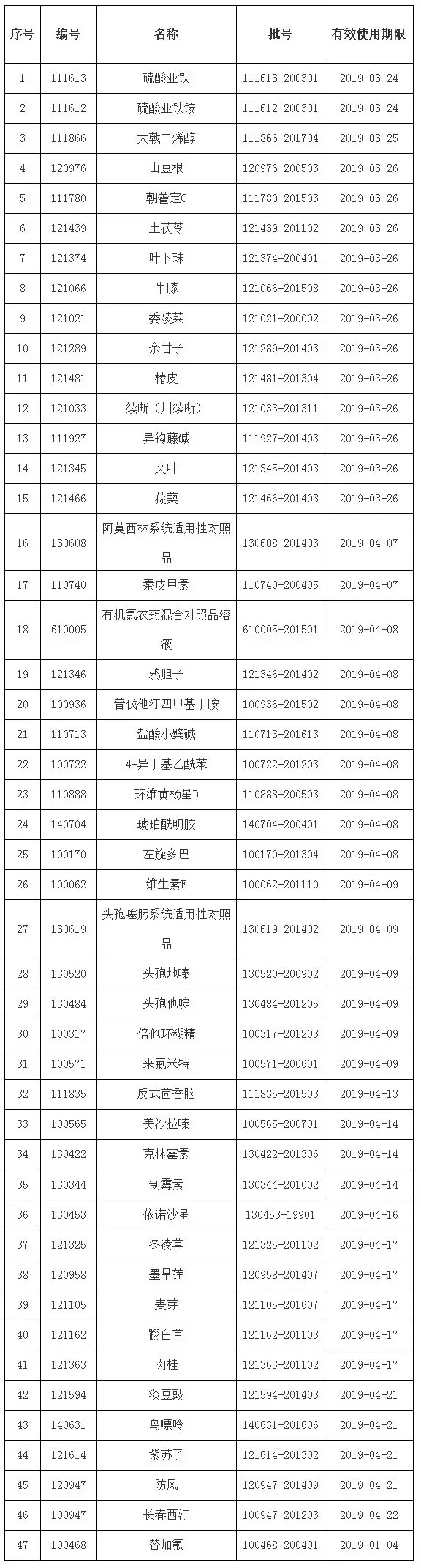 ? ? 2018年第十一期國家藥品標準物質供應新情況,包括47個即將換批品種的預計上市時間、47個即將失效品種的有效使用期限和2個停用品種名單。