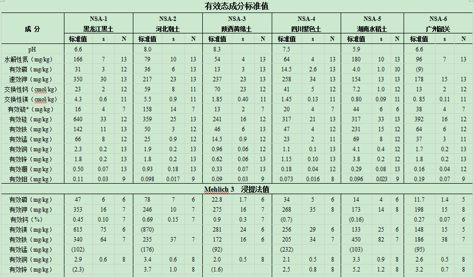 本系列六種土壤成分參比標準物質主要用于全國耕地調查與質量評價樣品分析的參比標準與質量監控; NSA系列為有效態成分,NST系列為全量成分。